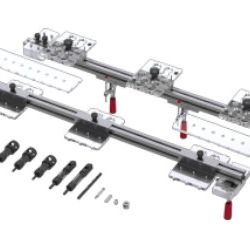 The patented Minifix jig set is used on 18-19 mm (3/4 inch) wood & panels. Drills minifix (cam) 15 mm standard holes with adjustable self-centering drilling bits 15 mm diameter. Drills minifix bolt & insert holes with adjustable self-centering drilling bits, 8-10 mm diameter. Drills 5 mm shelving pin holes in System 32 with self-centering drilling bits. Drills 8 mm minifix bolt on the side of panels. Jig set includes two main jigs, one for the front of panel and the other is available to drill holes on the mid-section of panel for fixed and/or separator parts.