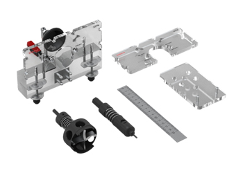 Menteşelerin montajı için, menteşe yuvası vida delikleri ve menteşe tabanının gövdeye montajı için delikleri açan şablondur. Şablonla, mermezlemeli ayarlı delme ucu sayesinde 35 mm çapında tas delikleri sabit derinlikte açılmaktadır. Ayarlanabilme özelliği sayesinde, dolap kapak kenarından 3 mm ile 15 mm arasındaki mesafelerde menteşe yuva yeri delinebilir. Bu özelliği ile hertürlü değişik, frenli, dereceli, düz, deve boynu ve süper deve boynu gibi menteşe montajları yapılabilmektedir. Farklı markalarda ki menteşe türlerine göre değiştirilebilen iki ayrı ana şablon ile , Hafele, Blum, Hettich ve diğer marka menteşelerin farklı delik yerleri açılabilmektedir. Set içerisine bulunan ilave bir şablon ile menteşe ayağı montajı, dolap kabini içinde yapılabilmektedir.